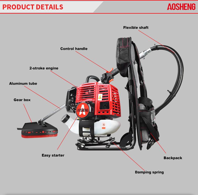 Motor de alto desempenho, cilindrada de 33CC. O uso profissional abre terreno baldio Tamanho do tubo 26 mm * 1,5 mm, eixo flexível de resistência. A largura de corte é 420mm Vida útil s...