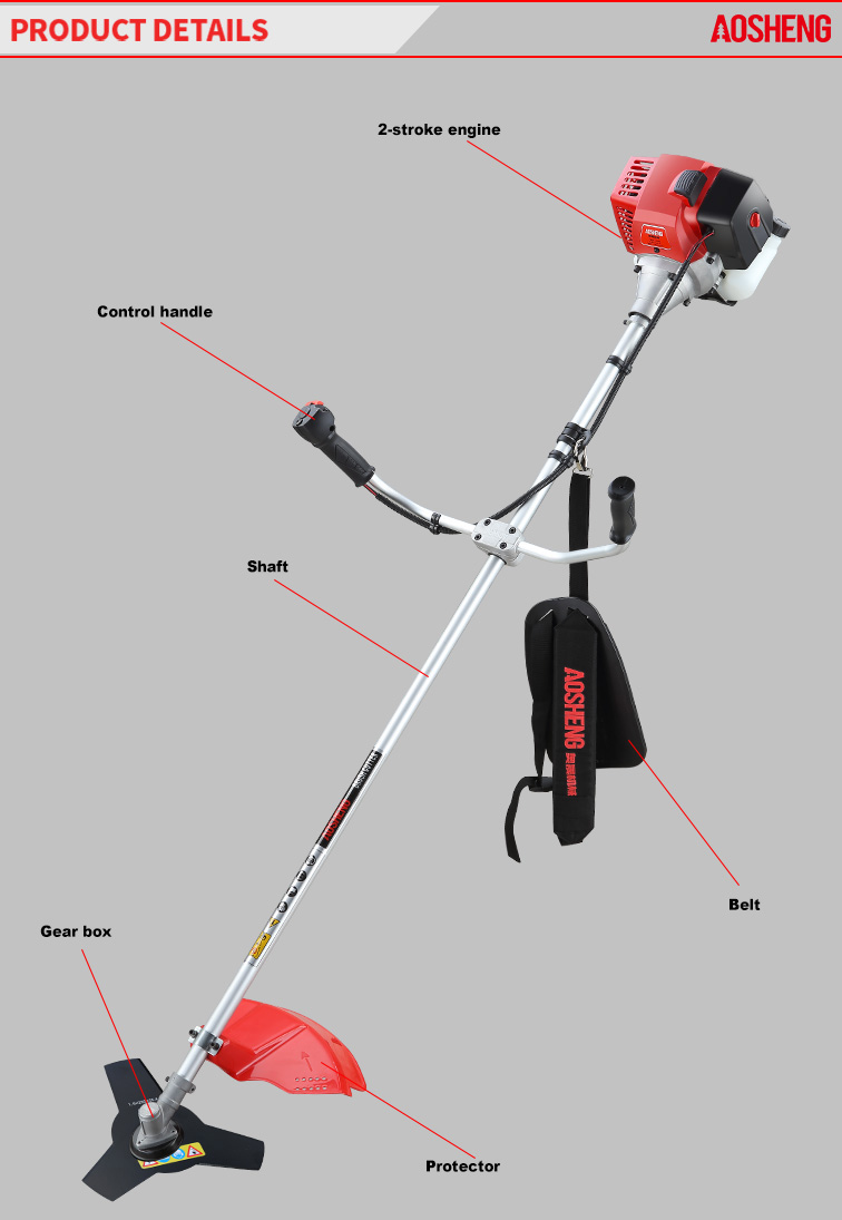 Motor de alto desempenho, cilindrada de 33CC. O uso profissional abre terreno baldio Tamanho do tubo 26 mm * 1,5 mm, eixo flexível de resistência. A largura de corte é 420mm Vida útil s...